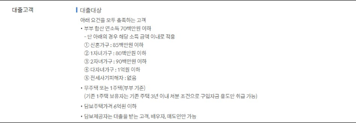 신청자는 무주택자 또는 1주택자여야 해요. 만약 1주택자로 신청할 경우에는 기존 주택을 2년 이내에 처분해야 한다는 점도 참고하시구요.